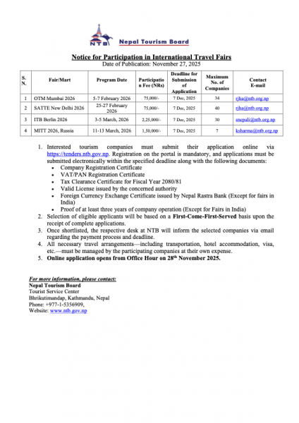 London, UK — 16th October — The Nepal Tourism Board (NTB) is set to make a dynamic impression at the World Travel Market (WTM) London 2025, taking place from 4 to 6 November 2025 at ExCeL London.Positioned at Nepal Stall N12-511, NTB will lead a... Read More
