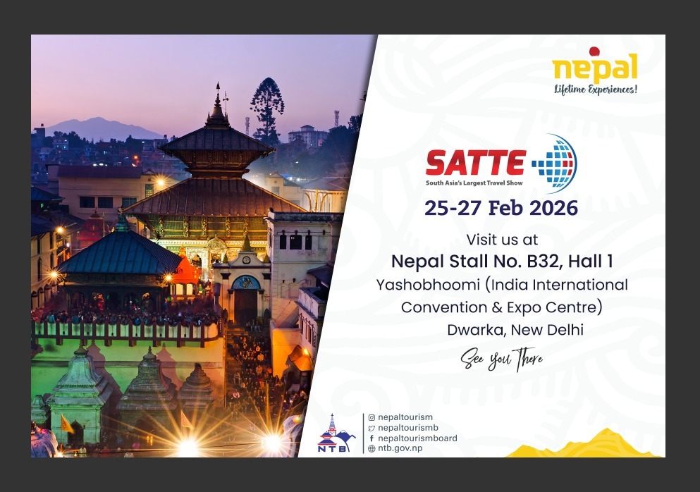 KATHMANDU, NEPAL – Nepal Tourism Board (NTB) is set to participate in the Nepal Pavilion (B 32) at SATTE 2026 (South Asia’s Travel & Tourism Exchange), taking place from 25–27 February 2026 at the state-of-the-art Yashobhoomi (India International Convention & Expo Centre), New Delhi.